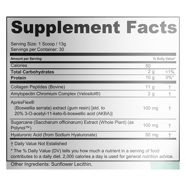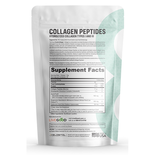 Die LiveGood Kollagenpeptide enthalten hydrolysiertes Kollagen Typ I & III aus grasgefüttertem Rind, kombiniert mit den fortschrittlichen Inhaltsstoffen Velositol™, ApresFlex™ und Polynol™. Diese Formulierung unterstützt gezielt die Struktur von Haut, Haaren, Nägeln sowie die Gesundheit von Gelenken und Muskeln.